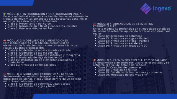 El curso proporciona una formación completa que abarca desde los conceptos fundamentales del entorno BIM hasta la creación avanzada de modelos estructurales en Revit. El participante comprenderá la lógica del modelado estructural paramétrico, la correcta definición de elementos estructurales y la importancia de una estructura de proyecto bien organizada.