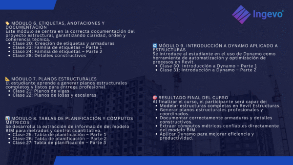 El curso desarrolla de manera práctica la creación de tablas de planificación y cómputos métricos, permitiendo al estudiante extraer cantidades reales de materiales directamente del modelo estructural.
